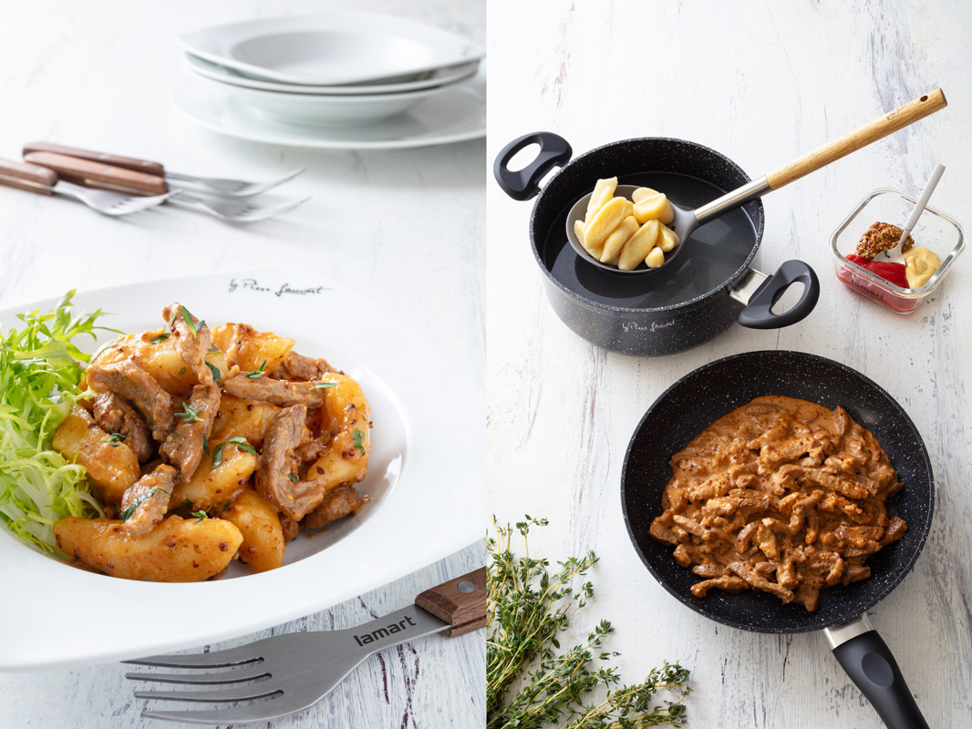 Zemiakové noky s bravčovou panenkou a horčicovou omáčkou