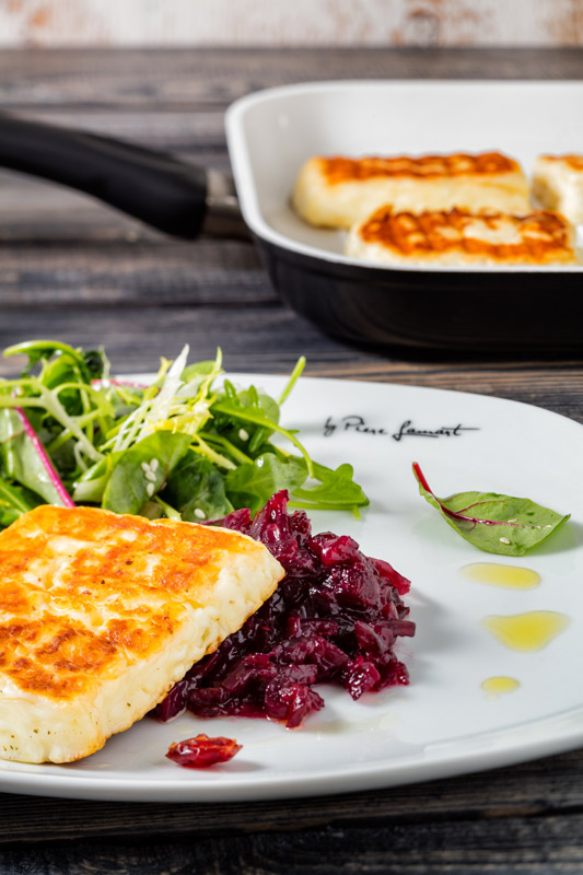 Grécky syr Halloumi nakrájame na rovnomerné plátky, ľahko okoreníme a grilujeme na rozpálenej panvici na olivovom oleji z oboch strán dozlatista.