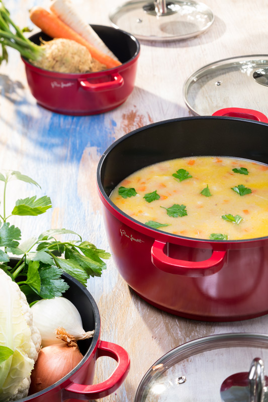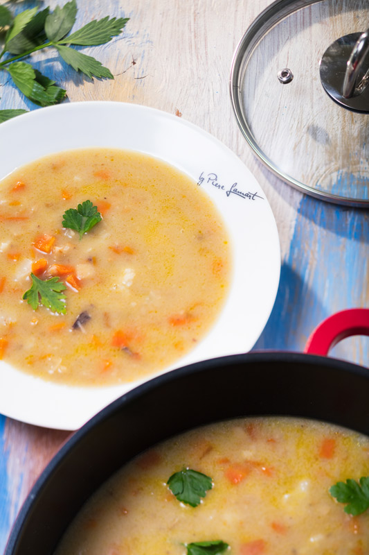 Maslo rozpustíme v hrnci, vsypeme na kúsky pokrájaný karfiol a rascu a spoločne so zvyškom koreňovej zeleniny pokrájanej na menšie kúsky zľahka orestujeme. Zalejeme scedeným husím vývarom a privedieme k varu. Potom zahustíme svetlou zápražkou z masla a múky a necháme cca pol hodiny prevariť.