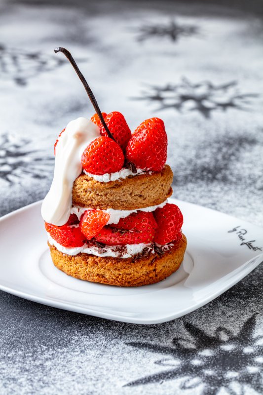 Po upečení na sušienky nanesieme Crème fraîche a doplníme nakrájanými jahodami a kyslou smotanou.