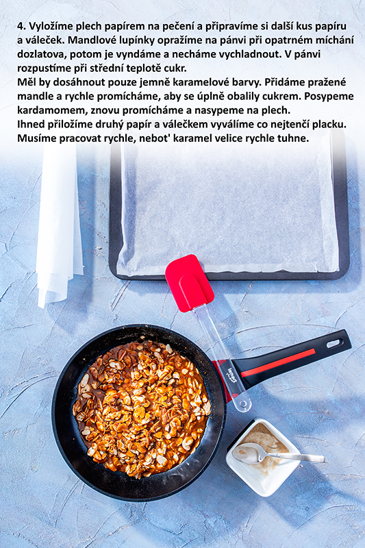 Vyložíme plech papierom na pečenie a pripravíme si ďalší kus papiera a valček. Mandľové lupienky opražíme na panvici pri opatrnom miešaní do zlatista, potom ich vyberieme a necháme vychladnúť. V panvici rozpustíme pri strednej teplote cukor. Mal by dosiahnuť iba jemnú karamelovú farbu. Pridáme pražené mandle a rýchlo premiešame, aby sa úplne obalili cukrom. Posypeme kardamómom, znovu premiešame a nasypeme na plech. Ihneď priložíme druhý papier a valčekom vyváľame na čo najtenšiu placku. Musíme pracovať rýchlo, pretože karamel veľmi rýchlo tuhne. Odstránime vrchný papier na pečenie a ostrým nožom v hmote naznačíme prúžky, ale neprekrojíme. Po úplnom vychladnutí karamel v týchto miestach rozlomíme.