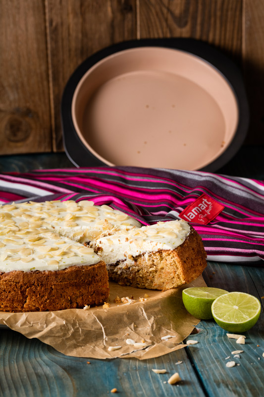 Na krém zmiešame uvedené ingrediencie, pridáme nastrúhanú kôru z 2 limetiek a vychladnutý koláč dôkladne potrieme. Nakoniec môžeme ozdobiť plátkami mandlí.