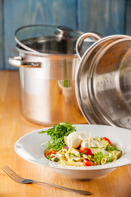 Do hrnca nalejeme vodu, ktorú mierne presolíte - asi ako je slaná morská voda. Privedieme k varu, nasypeme cestoviny a uvaríme. Cestoviny by nemali byť rozvarené. Precedíme a len teraz zmiešame so zvyšným olivovým olejom. Cestoviny nasypeme k orestovanej zelenine, opatrne premiešame a dáme na tanier. Posypeme veľkolistým petržlenom, doprostred taniera dáme mozzarellu a rukolu vychutenú olivovým olejom a soľou.