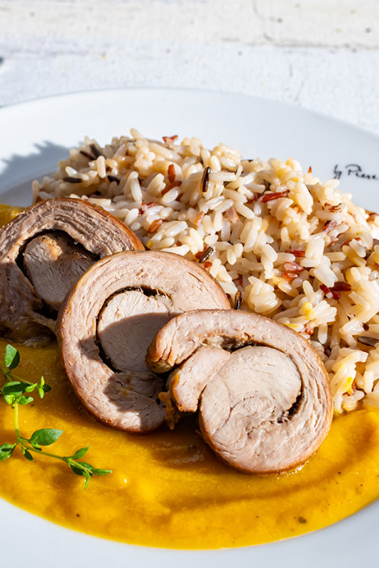 Hotové mäso nakrájame na plátky a servírujeme s omáčkou a divokou ryžou.