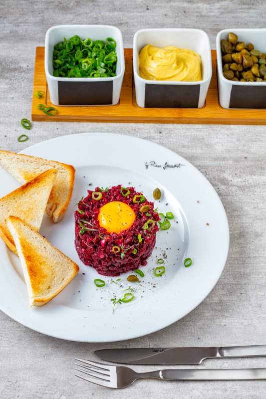 Pomocou krúžku na predjedlá (cca 7 cm v priemere) rozdelíme tatarák po štvrtkách na taniere a lyžicou vytvoríme uprostred jamku bez toho, aby sme krúžok sňali. Až po vytvorení priehlbiny ho opatrne odstránime smerom nahor.