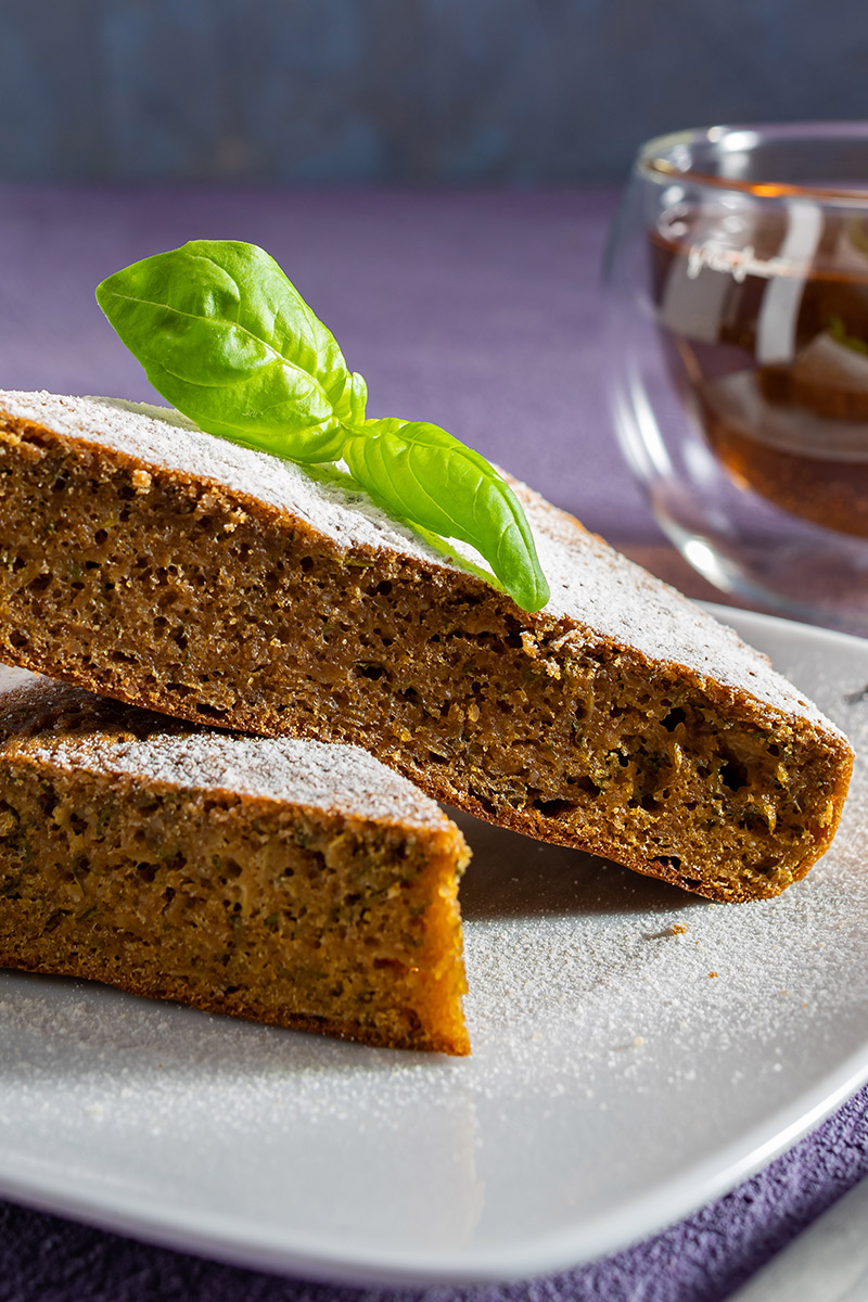Kousky koláče poprášíme moučkovým cukrem a podáváme vlažný nebo studený případně ozdobený listy bazalky.