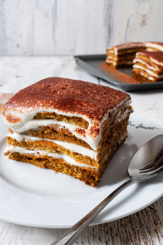 Upečené a vychladnuté cesto rozkrojíme na 4 diely. Vložíme do pekáča prvú vrstvu a polejeme kávou tak, aby dostatočne nasiakla.  Potom na cesto rozotrieme 1/4 krému, naň položíme ďalšiu vrstvu cesta a opakujeme celý postup. Navrch dáme poslednú vrstvu krému a uhladíme.