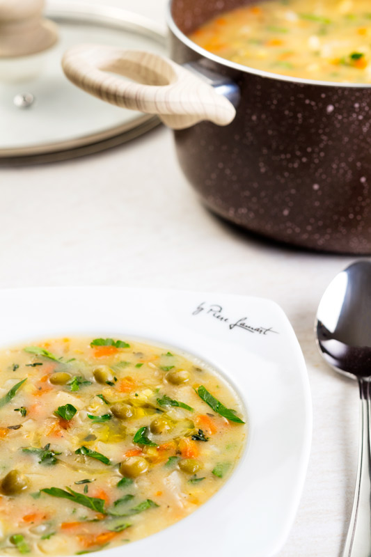 V inom hrnci si zvaríme nasekanú petržlenovú vňať, trebuľku a tymián a necháme vychladiť. Vychladeným scedeným vývarom zalejeme zápražku so zeleninou a privedieme do varu. Varíme asi pol hodiny, pokým nie je hrach a zelenina mäkká. Dochutíme soľou, korením a pri podávaní pokvapkáme olivovým olejom.