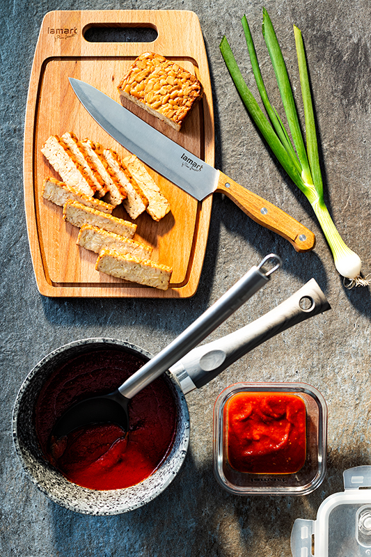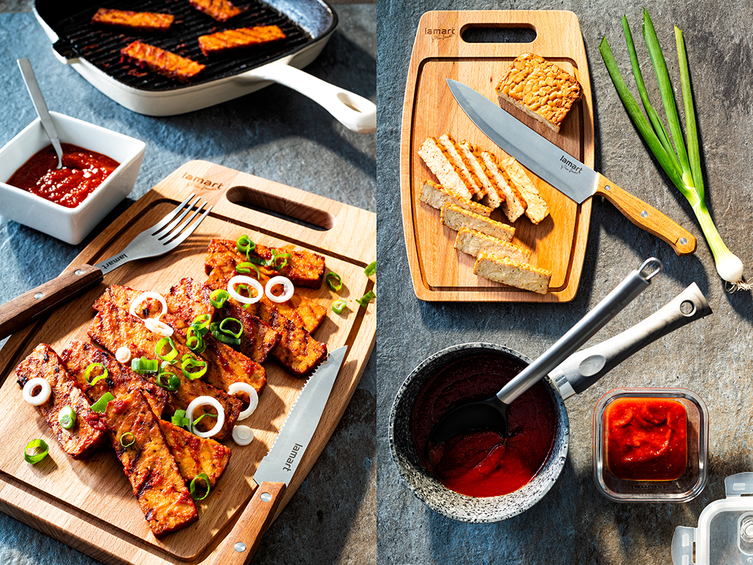 Grilovaný tempeh preložíme na lopárik, pokvapkáme BBQ omáčkou a ozdobíme čerstvou cibuľkou.