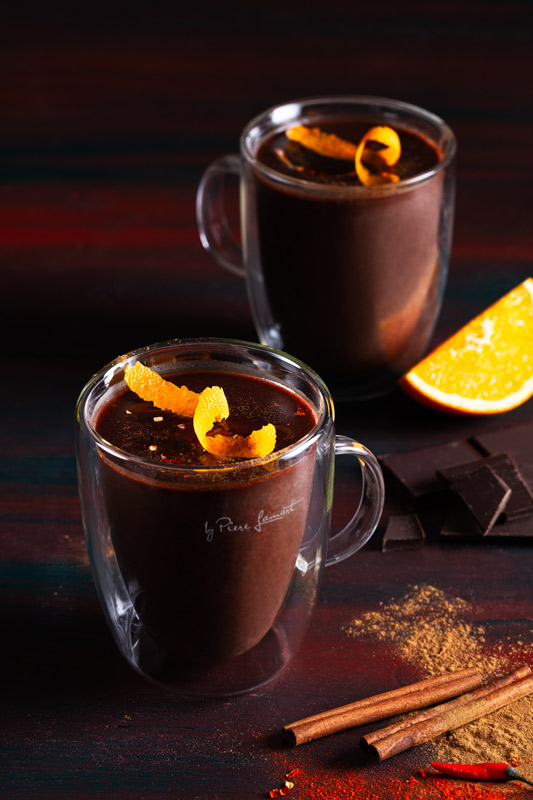 Mléko nalijeme do hrnce a přivedeme k varu. Přidáme kakao, med a metličkou promícháváme, tak aby nezůstali žádné hrudky. Odložíme stranou. Čokoládu nalámeme na malé kousky, rozpustíme ve vodní lázní a dobře promícháme. V jiném hrnci přivedeme smetanu k varu. Do rozpuštěné čokolády po 1/3 stěrkou zapracujeme zahřátou smetanu. Nejdříve začne vznikat hustá emulze a bude to vypadat, jakoby se čokoláda srazila. V tu chvíli přidáme další 1/3 smetany. Pokračujeme a zapracujeme celý zbytek smetany. Emulzi pak vmícháme do zahřátého ochuceného mléka. Hned po zamícháni servírujeme do hrnku a ozdobíme nastrouhanou kůrou z pomeranče, skořici a špetkou chilli.