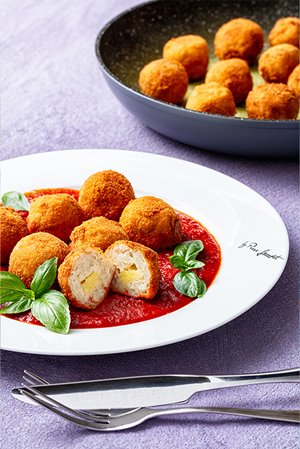 Zo zmesi vytvarujeme guličky veľkosti vlašského orecha a do každej vtlačíme kocku syru, opäť dôkladne spojíme a obalíme v rozšľahanom vajci a v strúhanke. Na rozpálenom oleji osmažíme do zlata.