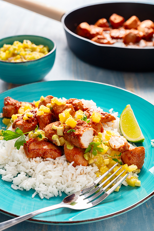 Na taniere servírujeme ryžu, kúsky kurčaťa s omáčkou, posypeme salsou a čerstvým koriandrom alebo petržlenovou vňaťou.