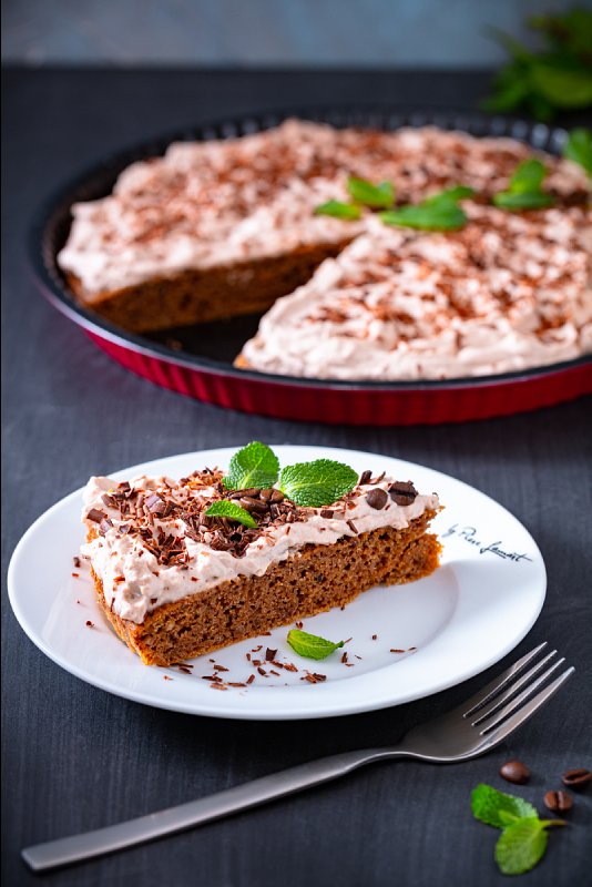 Počas pečenia vložíme všetky suroviny na krém do šľahača. Najskôr šľaháme opatrne, aby sa suroviny spojili, potom zvýšime rýchlosť a ušľaháme hustý krém. Krém nanesieme na vychladnutý koláč a ozdobíme postrúhanou čokoládou