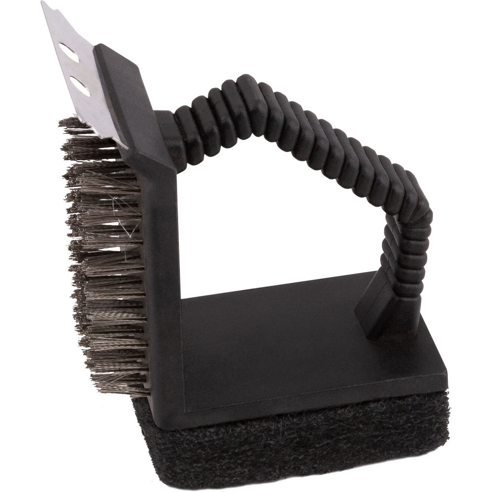 Kefa na gril obsahuje oceľové štetiny, nerezovú škrabku a oceľovú drôtenku s plastovou rukoväťou pre pohodlné držanie v ruke.