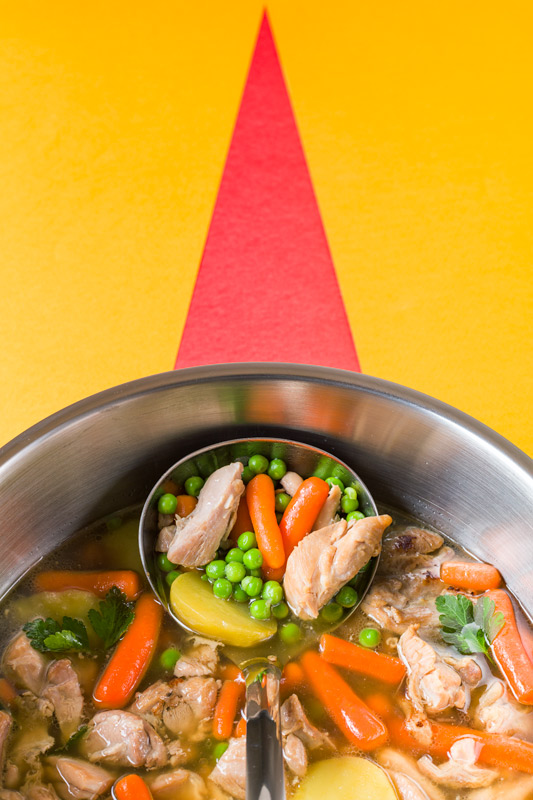 Potom pridáme karotku a hrášok a spoločne dusíme do mäkka. Ku koncu varenia zahustíme zmes maslovou zápražkou, dochutíme soľou, korením a muškátovým orieškom a môžeme podávať.