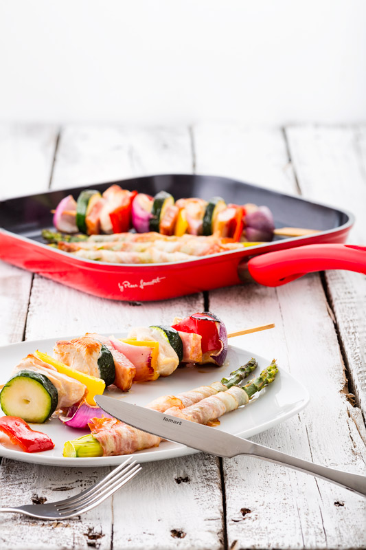 Kuracie prsia, papriku, anglickú slaninu, cuketu a cibuľu nakrájame na kúsky a striedavo napichujeme na špíz, až ho máme plný. Osolíme, okoreníme, potrieme olivovým olejom a opekáme na panvičke zo všetkých strán. Pred dopečením prihodíme ku špízu hrudku masla, necháme rozpustiť a špízy v masielku obalíme.