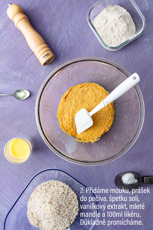 Maslo vymiešame s cukrom a vajcami do peny. Pridáme múku, prášok do pečiva, štipku soli, vanilkový extrakt, mleté mandle a 100 ml likéru. Dôkladne premiešame.