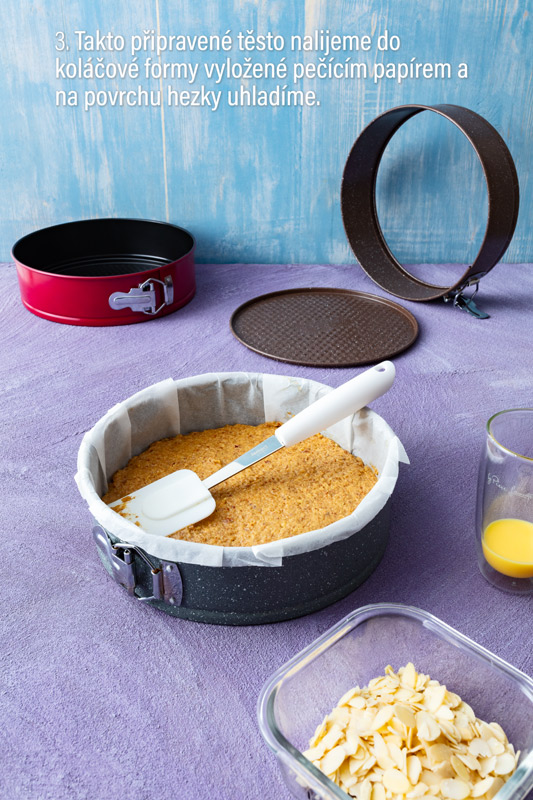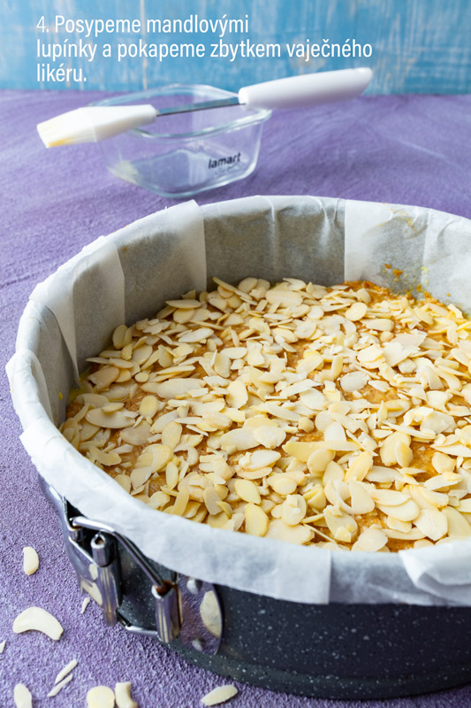 Takto pripravené cesto nalejeme do koláčovej formy vyloženej papierom na pečenie a na povrchu pekne uhladíme. Posypeme mandľovými lupienkami a pokvapkáme zvyškom vaječného likéru.
