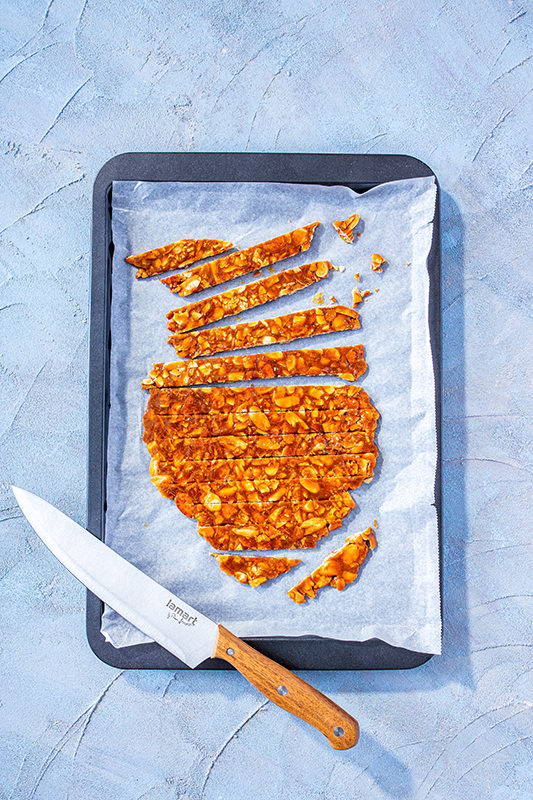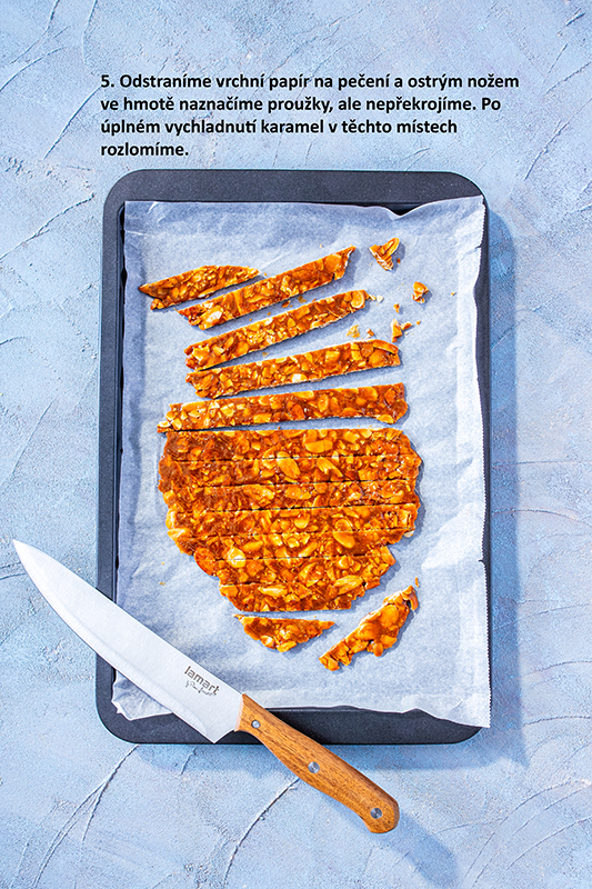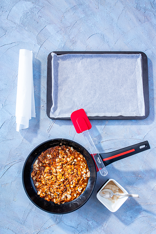 Vyložíme plech papierom na pečenie a pripravíme si ďalší kus papiera a valček. Mandľové lupienky opražíme na panvici pri opatrnom miešaní do zlatista, potom ich vyberieme a necháme vychladnúť. V panvici rozpustíme pri strednej teplote cukor. Mal by dosiahnuť iba jemnú karamelovú farbu. Pridáme pražené mandle a rýchlo premiešame, aby sa úplne obalili cukrom. Posypeme kardamómom, znovu premiešame a nasypeme na plech. Ihneď priložíme druhý papier a valčekom vyváľame na čo najtenšiu placku. Musíme pracovať rýchlo, pretože karamel veľmi rýchlo tuhne. Odstránime vrchný papier na pečenie a ostrým nožom v hmote naznačíme prúžky, ale neprekrojíme. Po úplnom vychladnutí karamel v týchto miestach rozlomíme.