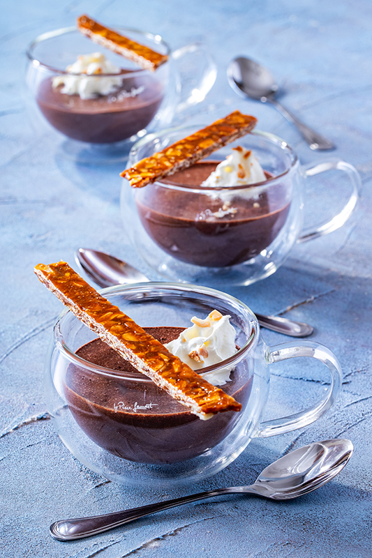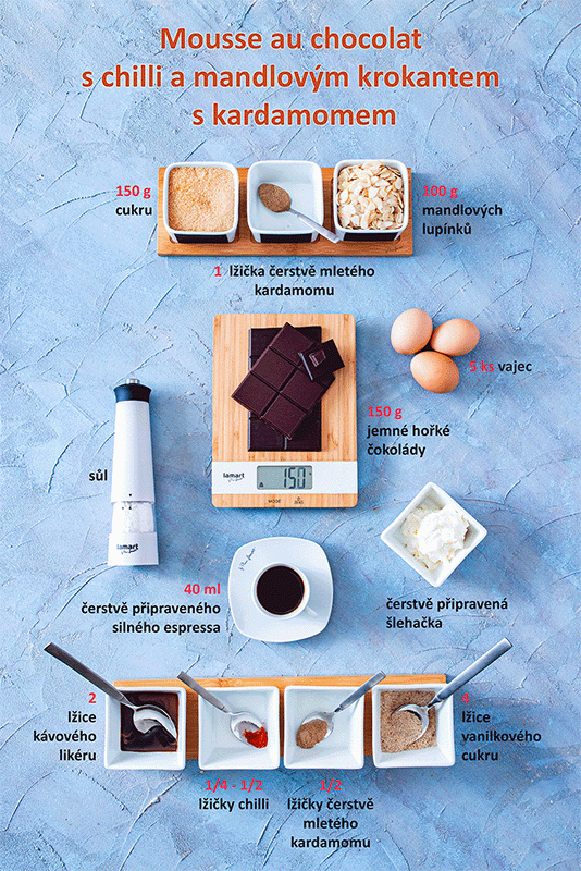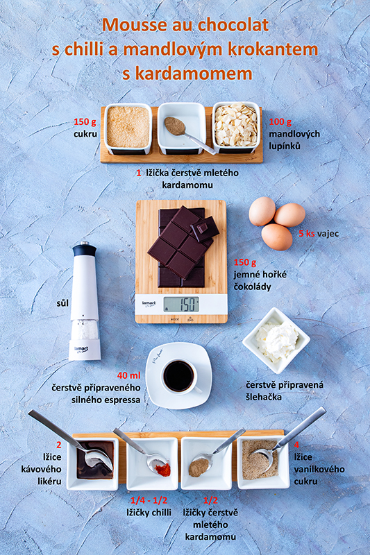 Mousse au chocolat s chilli a mandľovým krokantom s kardamómom