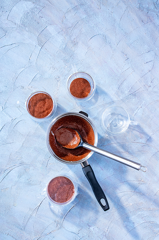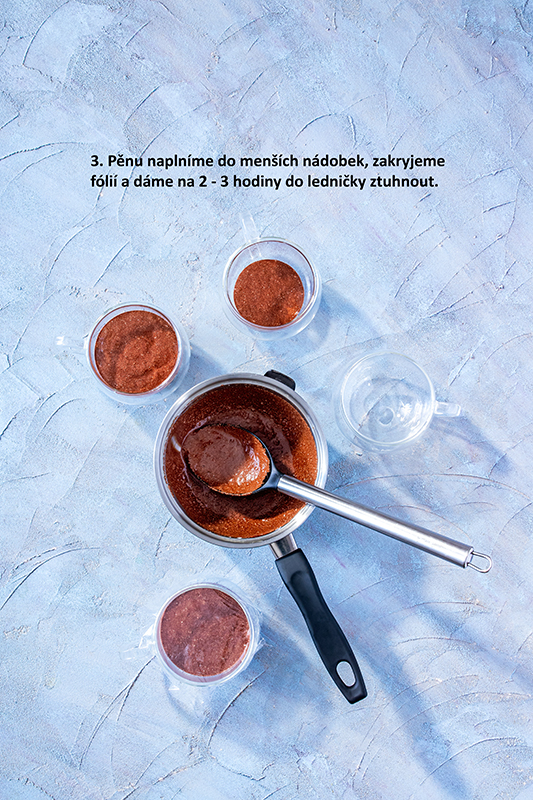 Každú nádobku s hotovou čokoládovou penou podľa obľuby dozdobíme kopčekom šľahačky a 1 tyčinkou mandľového krokantu s kardamómom a podávame.