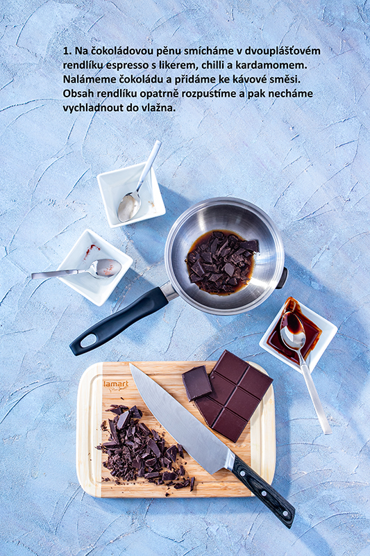 Na čokoládovú penu zmiešame v dvojplášťovej rajnici espresso s likérom, chilli a kardamómom. Nalámeme čokoládu a pridáme ku kávovej zmesi. Obsah rajnice opatrne rozpustíme a potom necháme vychladnúť do vlažna. Oddelíme bielky a žĺtky. Žĺtky ušľaháme s vanilkovým cukrom do svetlej peny, potom zmiešame s čokoládovou hmotou. Z bielkov a štipky soli ušľaháme tuhý sneh a opatrne vmiešame do čokoládovej hmoty. Penu naplníme do menších nádobiek, zakryjeme fóliou a dáme na 2 až 3 hodiny do chladničky stuhnúť.