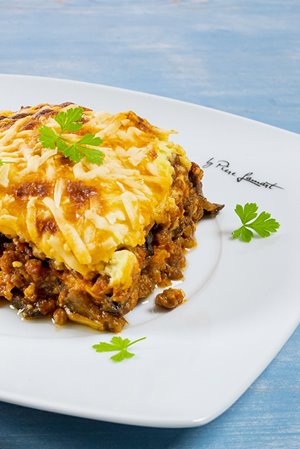 Baklažány nakrájame na plátky hrubé asi 5 mm, ugrilujeme na grilovacej panvici, odložíme stranou na neskoršie použitie a pripravíme si syr nastrúhaný na hrubom strúhadle. Na panvici rozohrejeme 2 lyžice oleja a opražíme na ňom mäso do ružova. Potom pridáme olúpaný cesnak a takto opekáme zhruba 5 minút. Následne cesnak vyberieme a mäso podlejeme bielym vínom, ktoré pri vare necháme odpariť. Potom vlejeme drvené paradajky, osolíme, okoreníme a zasypeme škoricou. Celú zmes premiešame, privedieme do varu, zakryjeme pokrievkou a varíme ďalších 15 minút. Po uplynutí tejto doby necháme asi 10 minút chladnúť.