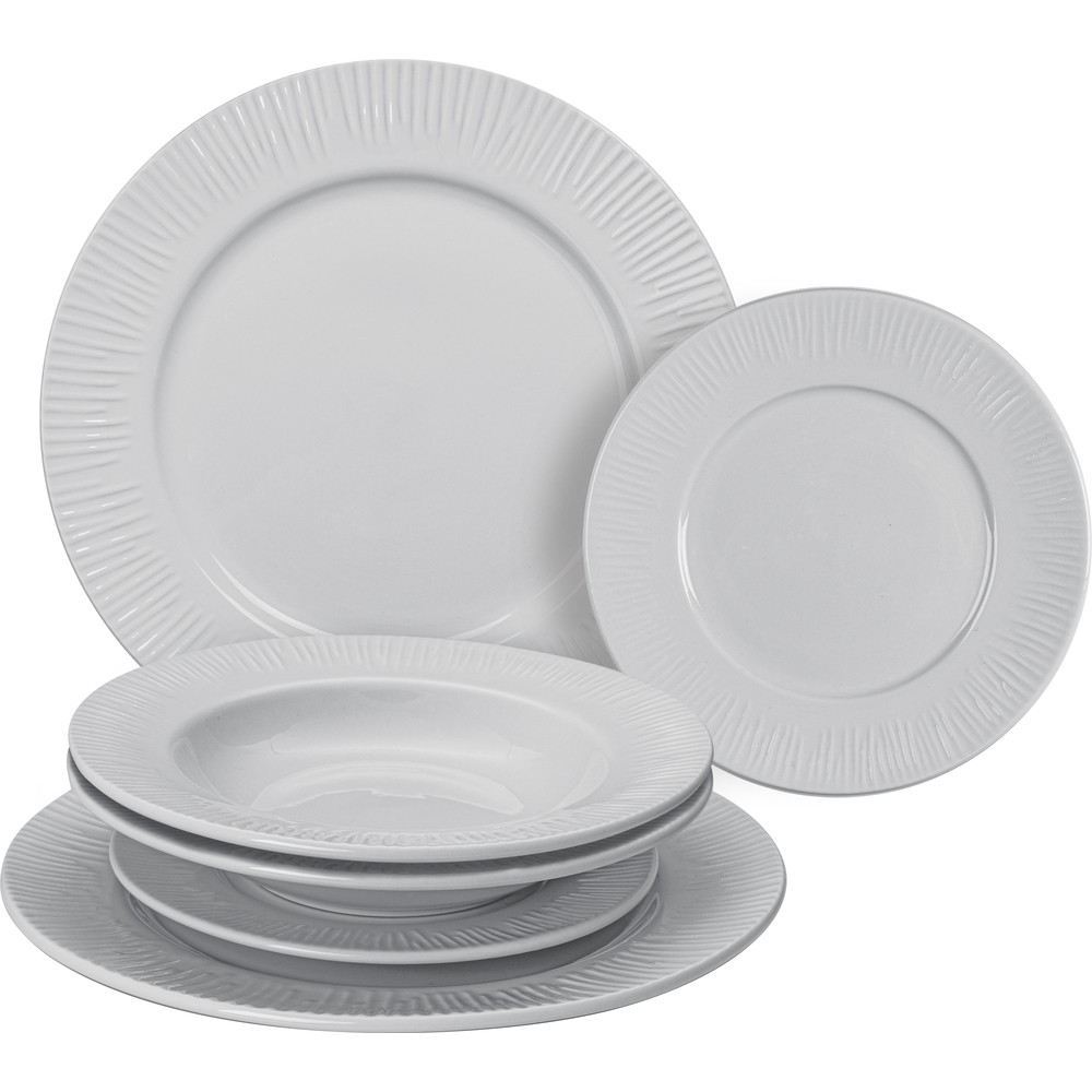 Sada jedálenských tanierov obsahuje 2x plytký tanier, 2x hlboký tanier a 2x dezertný tanier.