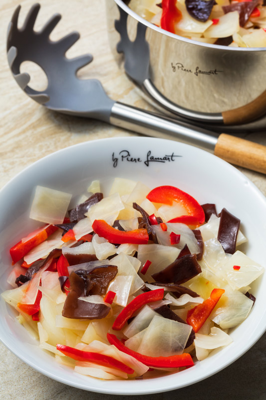 - Namiesto sterilizovanej kapie môžeme dať surovú červenú papriku, ktorú nakrájame na tenké prúžky a primiešame do horúcej sparenej kapusty spoločne s octom a cukrom a hubami.