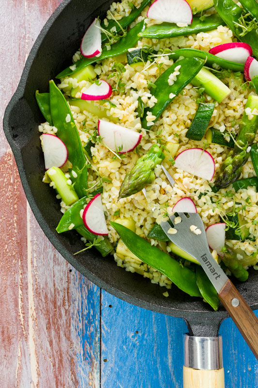 Na olivovom oleji orestujeme najemno nakrájanú cibuľu, pridáme olúpanú a nakrájanú špargľu, mladý hrášok a nakrájanú cuketu. Spoločne orestujeme a pridáme prepláchnutý bulgur. Chvíľu restujeme, osolíme, okoreníme, a potom všetko zalejeme vodou alebo zeleninovým vývarom a necháme prikryté napučať.