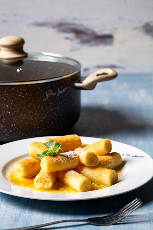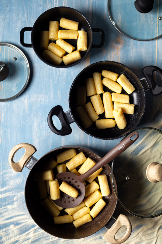 Zemiaky uvaríme v šupke a necháme vychladnúť. Potom ich ošúpeme a nastrúhame na strúhadle na jemno. Pridáme škrob, soľ, vajce, múku a vypracujeme cestu. Na pomúčenom stole vyvaľkáme tenký dlhý valček, ktorý rozdelíme na diely a pripravíme krátke valčeky (šišky)