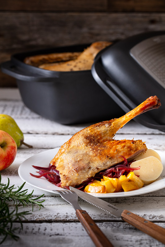 Asi dve hodiny pred pečením hus vyberieme z chladničky a necháme stáť pri izbovej teplote. Rúru predohrejeme na 130°C, a pečieme prikrytú asi 4-6 hodin. Hus pečieme prsiami dole a priebežne podlievame výpekom. Asi v  polovici pečenia hus otočíme na chrbát a dopekáme. Ku koncu pečenia hus odokryjeme a pridáme do pekáče zvyšné hrušky a jablká nakrájaná na kocky a společne dopečieme.