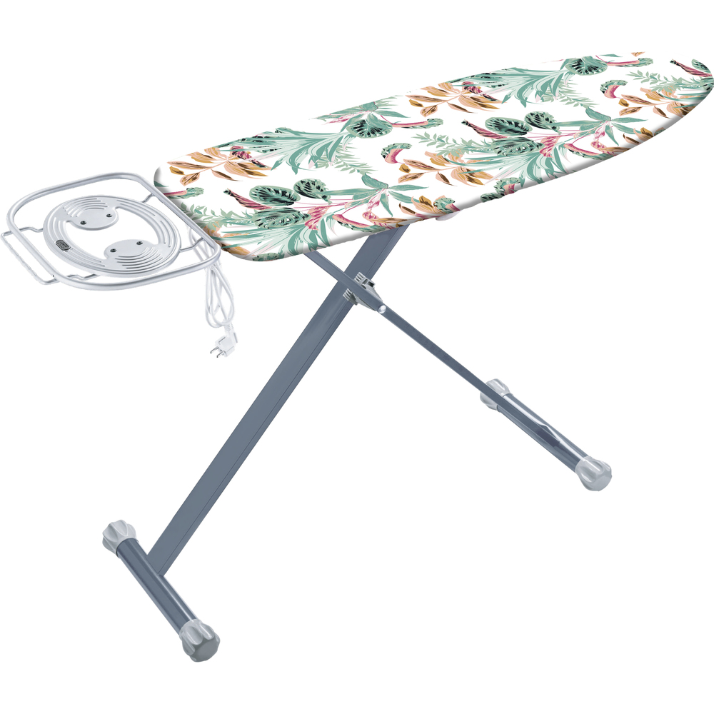 Kvalitná žehliaca doska vybavená transportným zámkom, žehliacou plochou odvádzajúcou paru a s elektrickou zásuvkou.